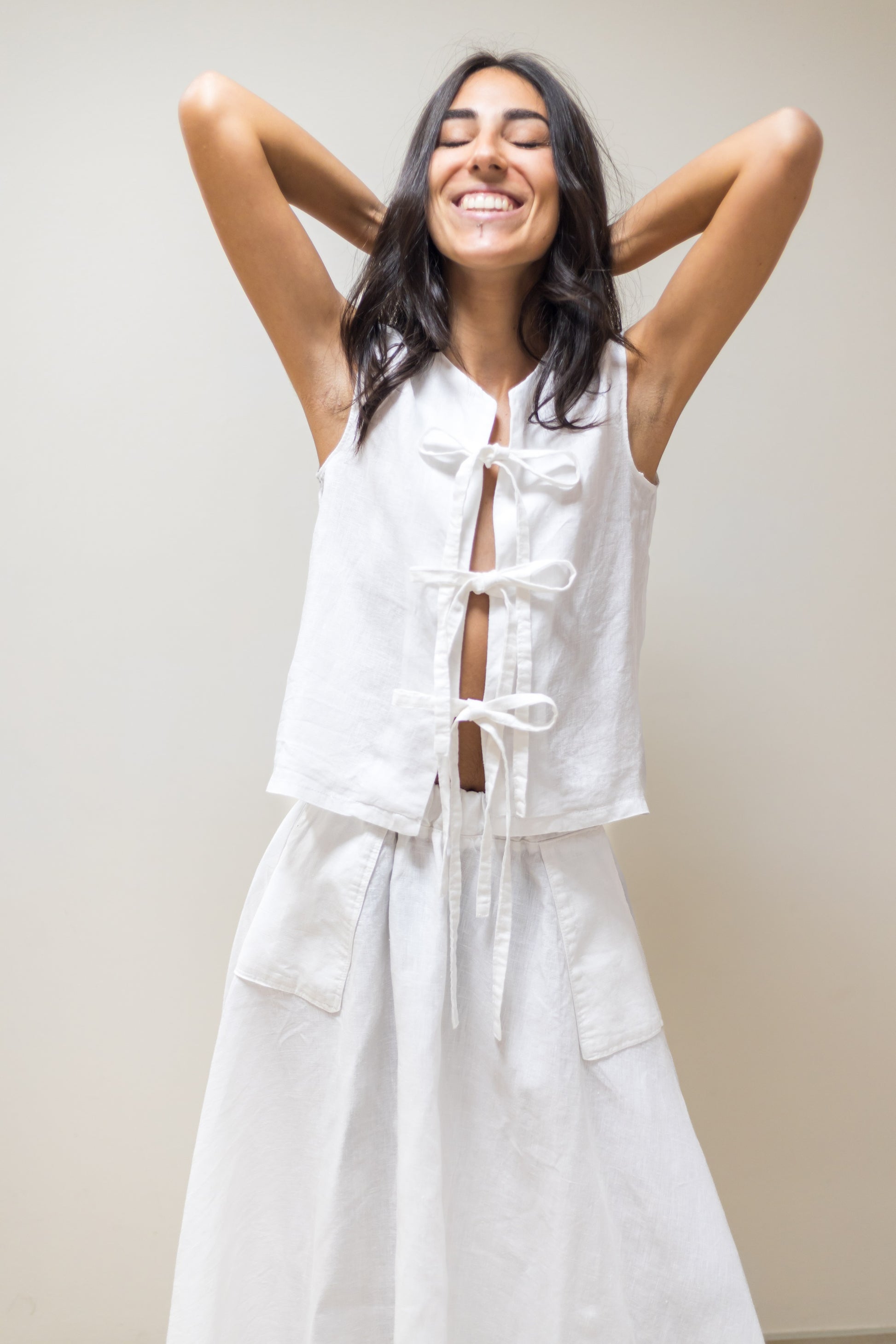 Gilet strutturato in puro lino, chiuso frontalmente da tre fiocchi realizzati a mano.