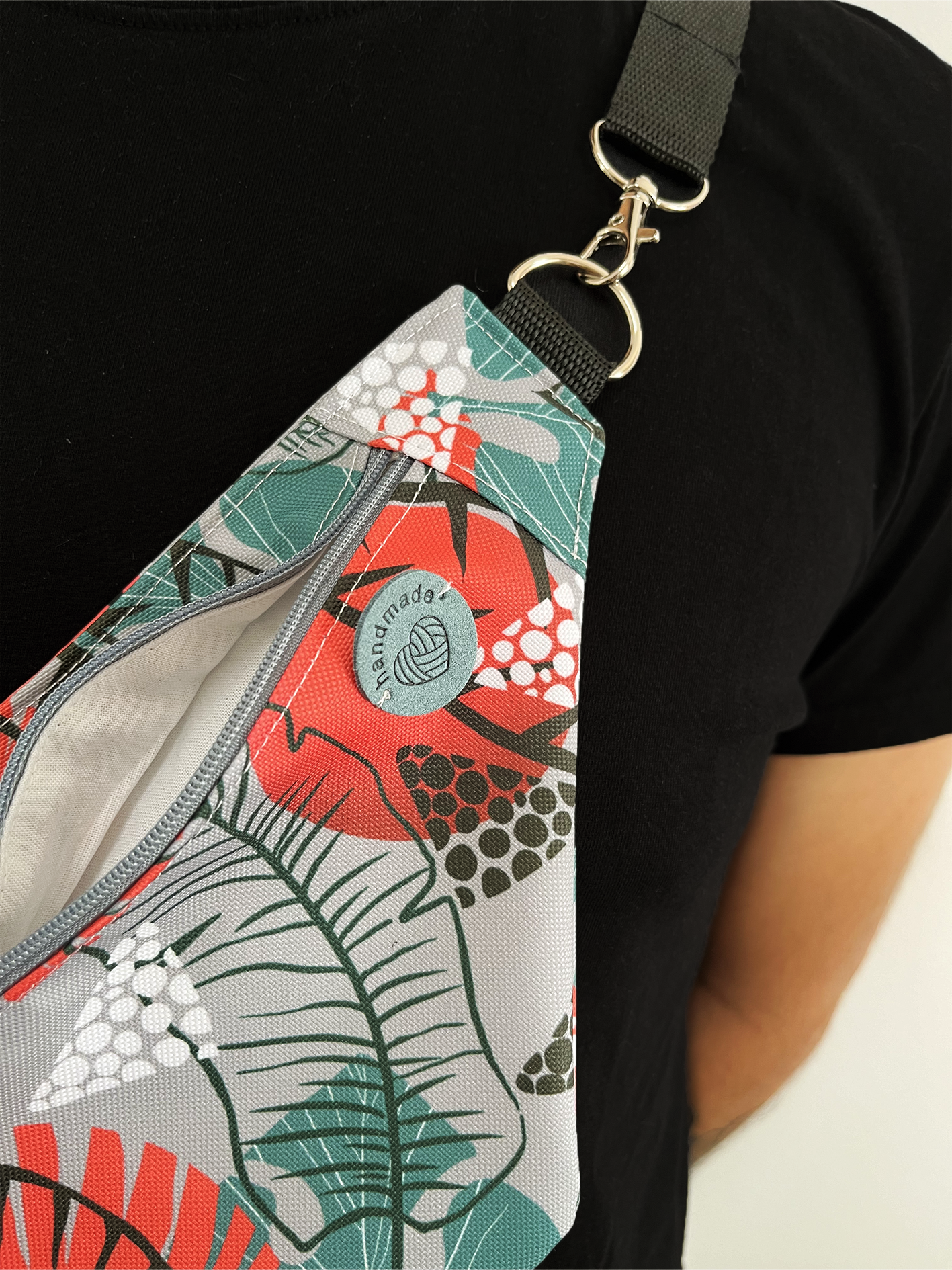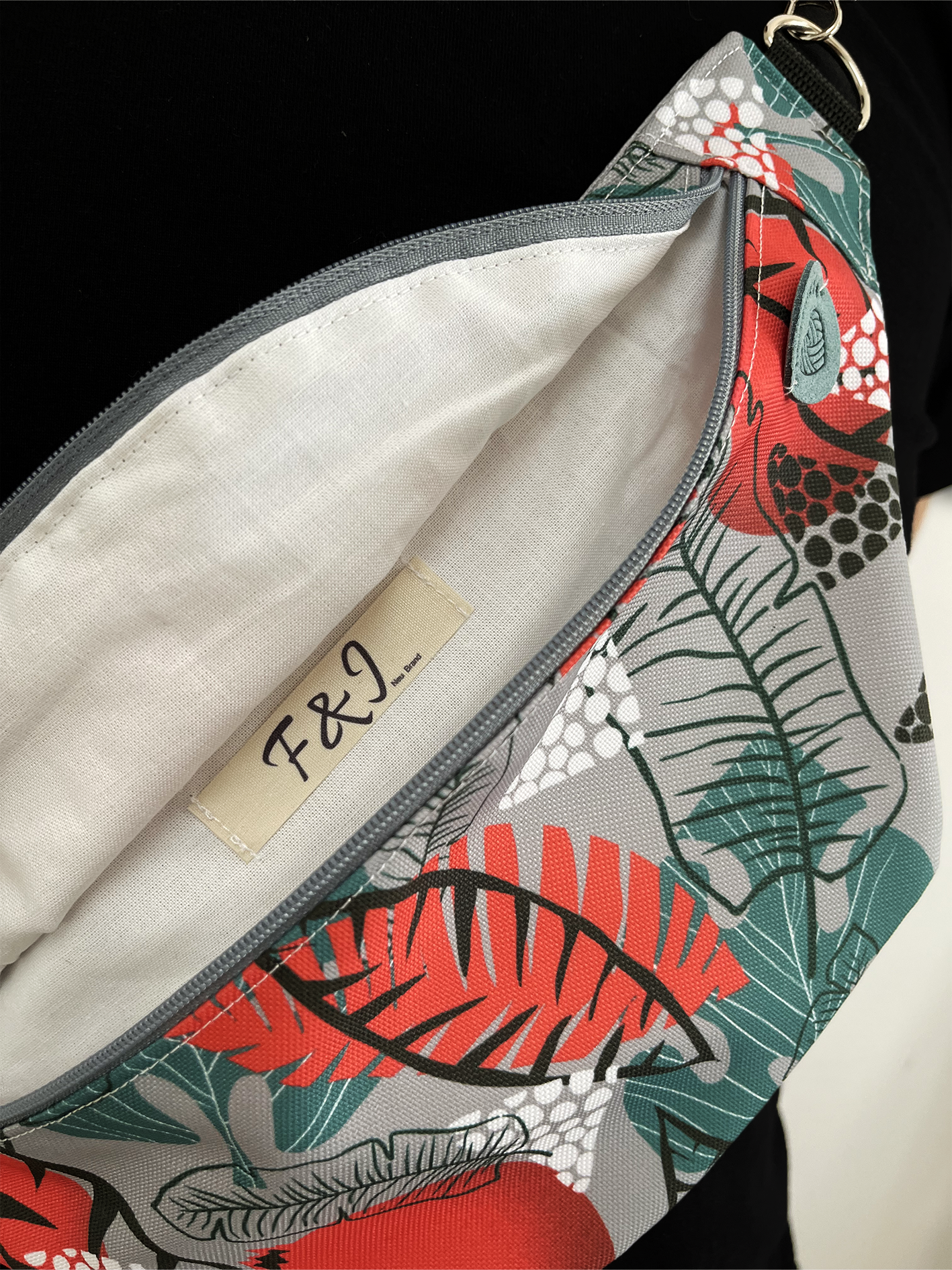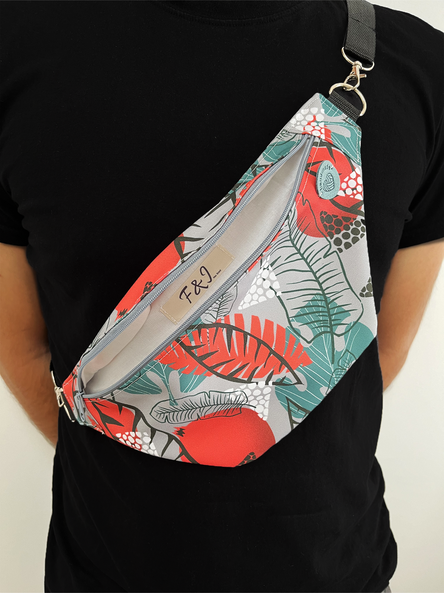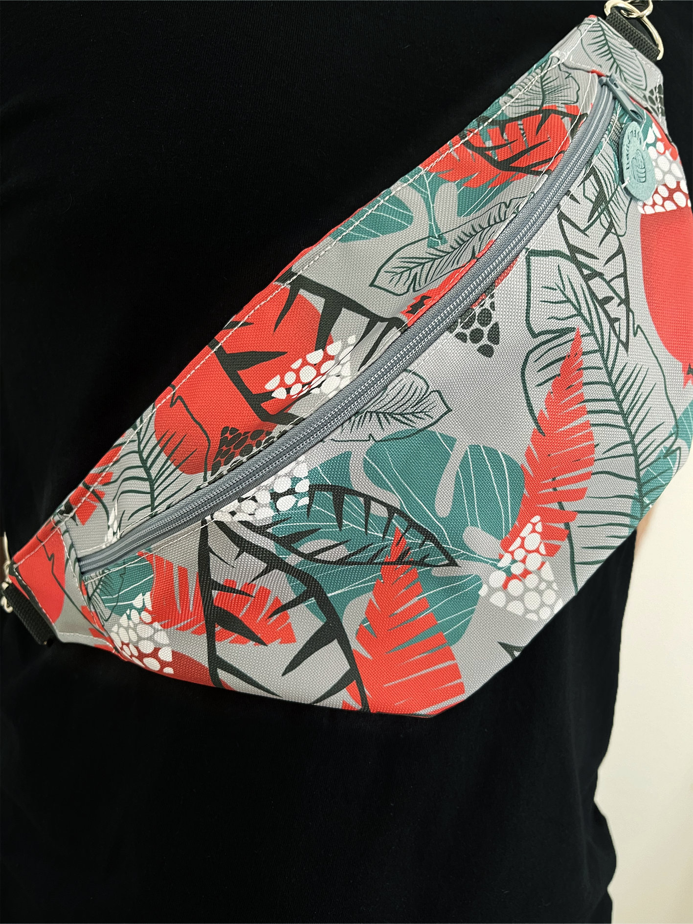 Il tessuto esterno, caratterizzato dalla fantasia distintiva del nostro brand, non è solo esteticamente accattivante, ma è anche impermeabile, garantendo una protezione ottimale contro la pioggia. Che tu stia affrontando una giornata di pioggia o semplicemente voglia un look moderno e resistente, questo marsupio è la scelta ideale.