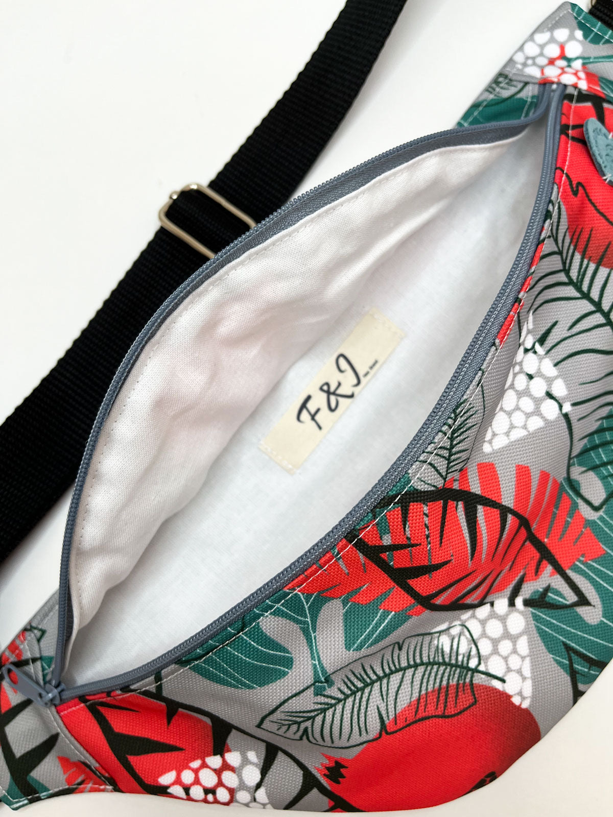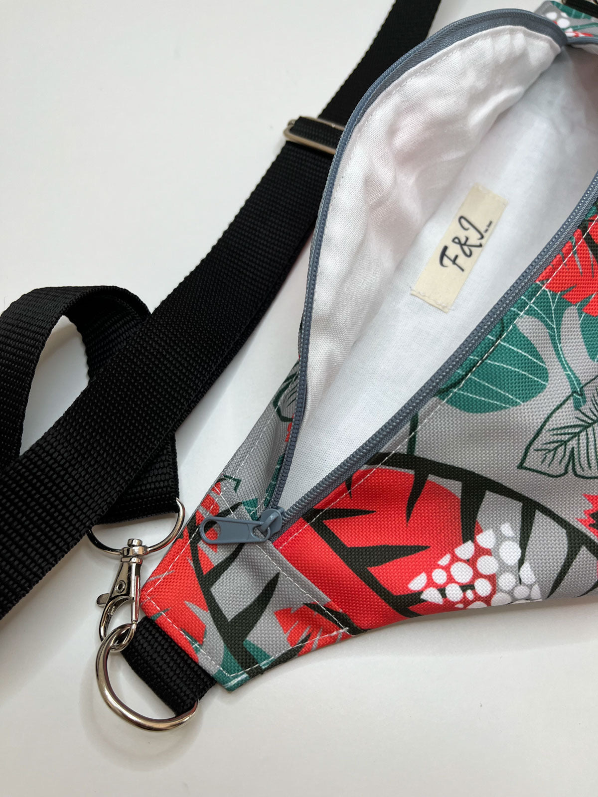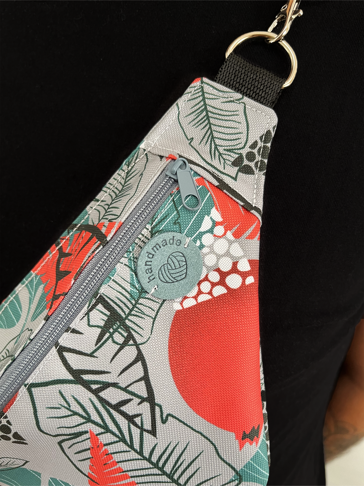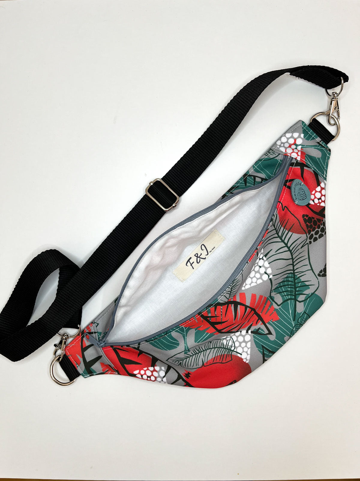 Il tessuto esterno, caratterizzato dalla fantasia distintiva del nostro brand, non è solo esteticamente accattivante, ma è anche impermeabile, garantendo una protezione ottimale contro la pioggia. Che tu stia affrontando una giornata di pioggia o semplicemente voglia un look moderno e resistente, questo marsupio è la scelta ideale.