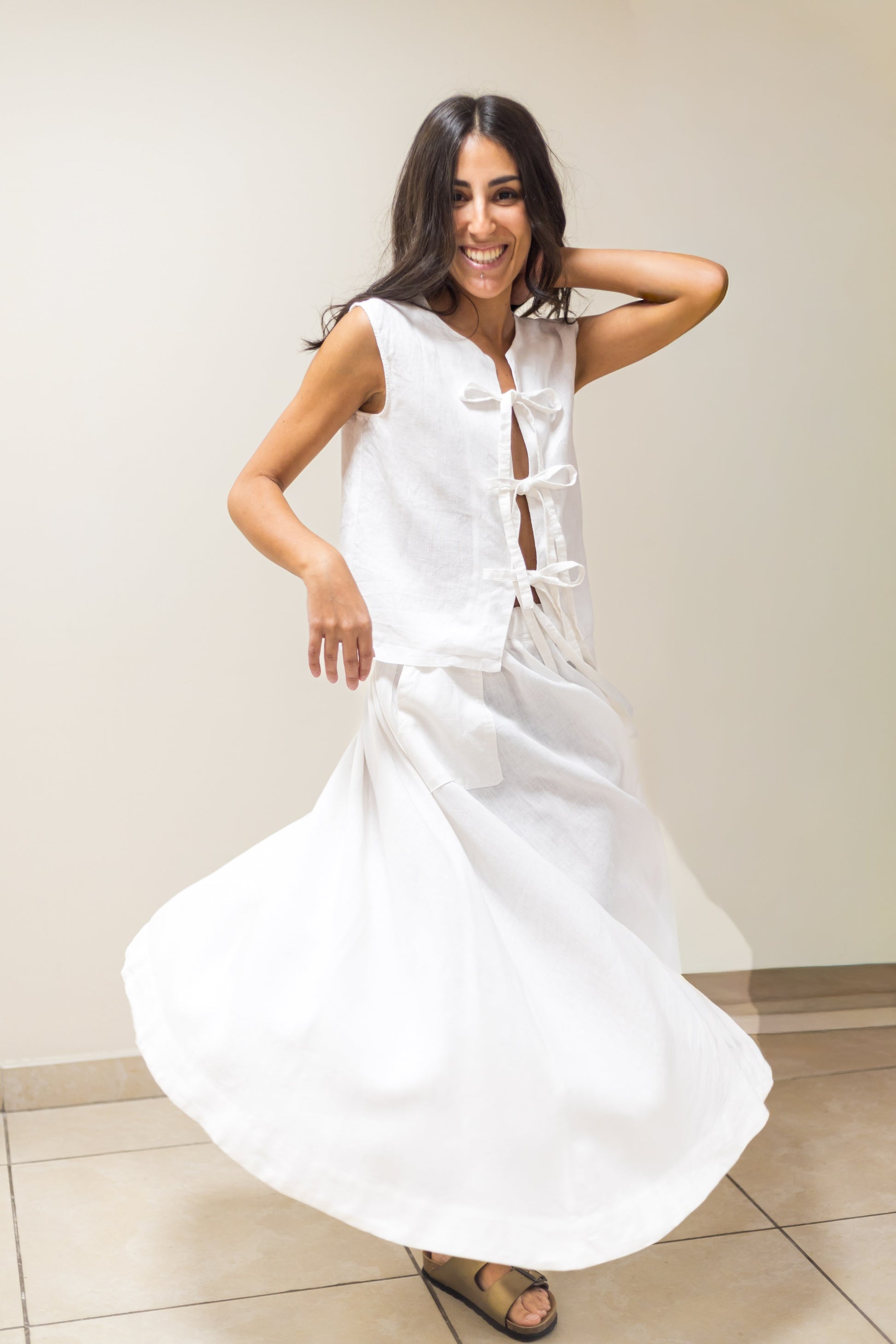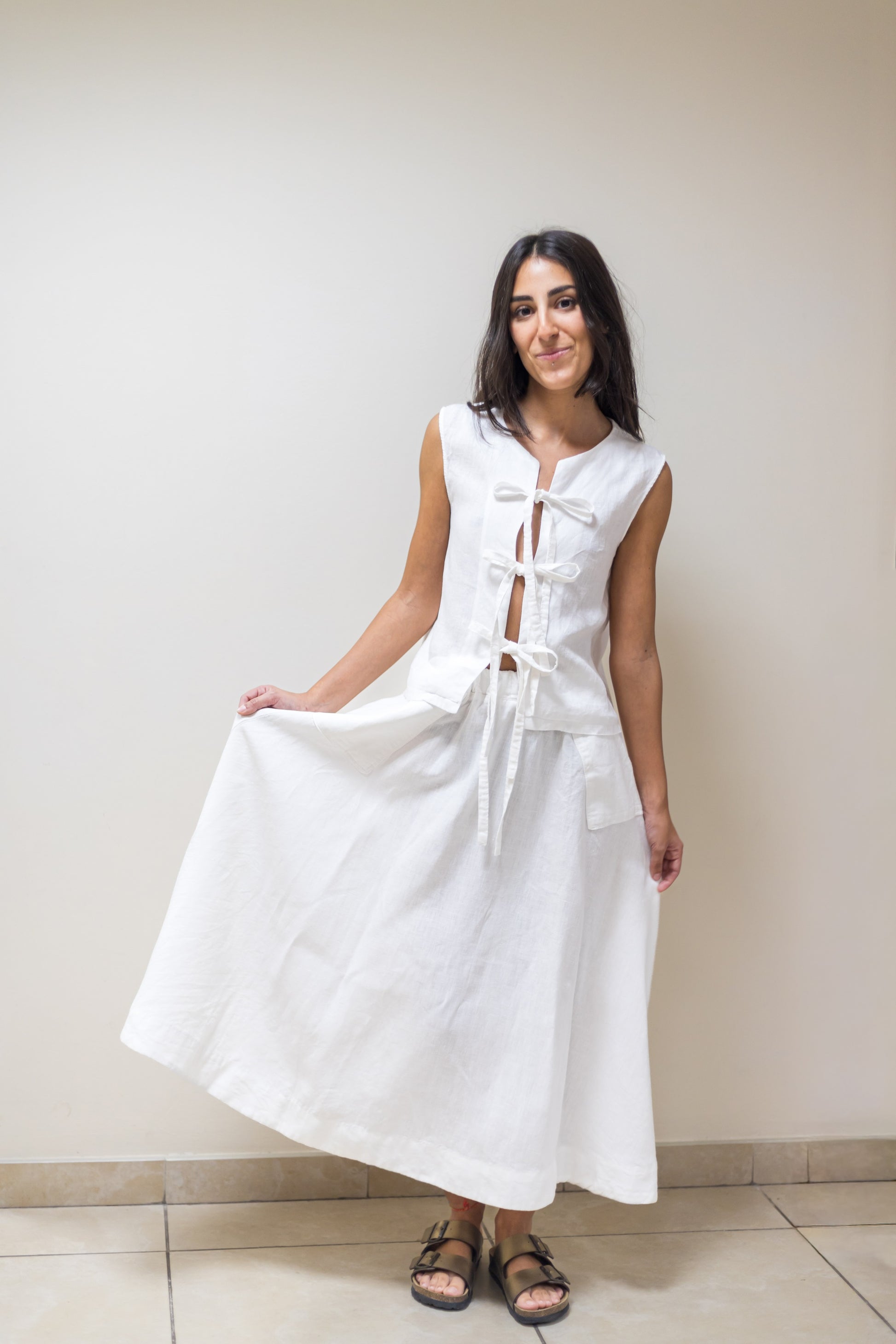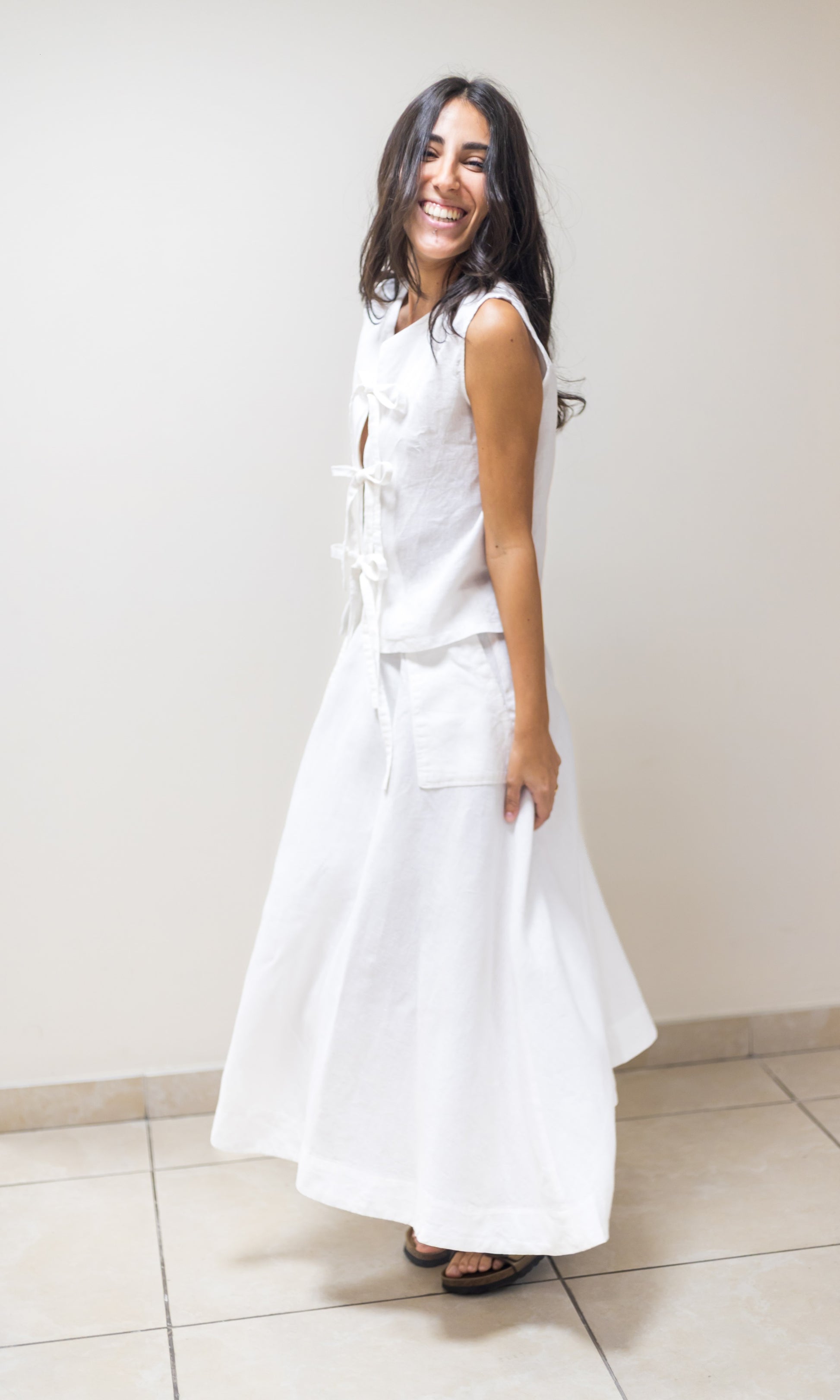 Gonna lunga morbida, fluida, ampia in puro lino, con due tasche laterali e vita elastica che assicura una vestibilità comoda e adattabile.